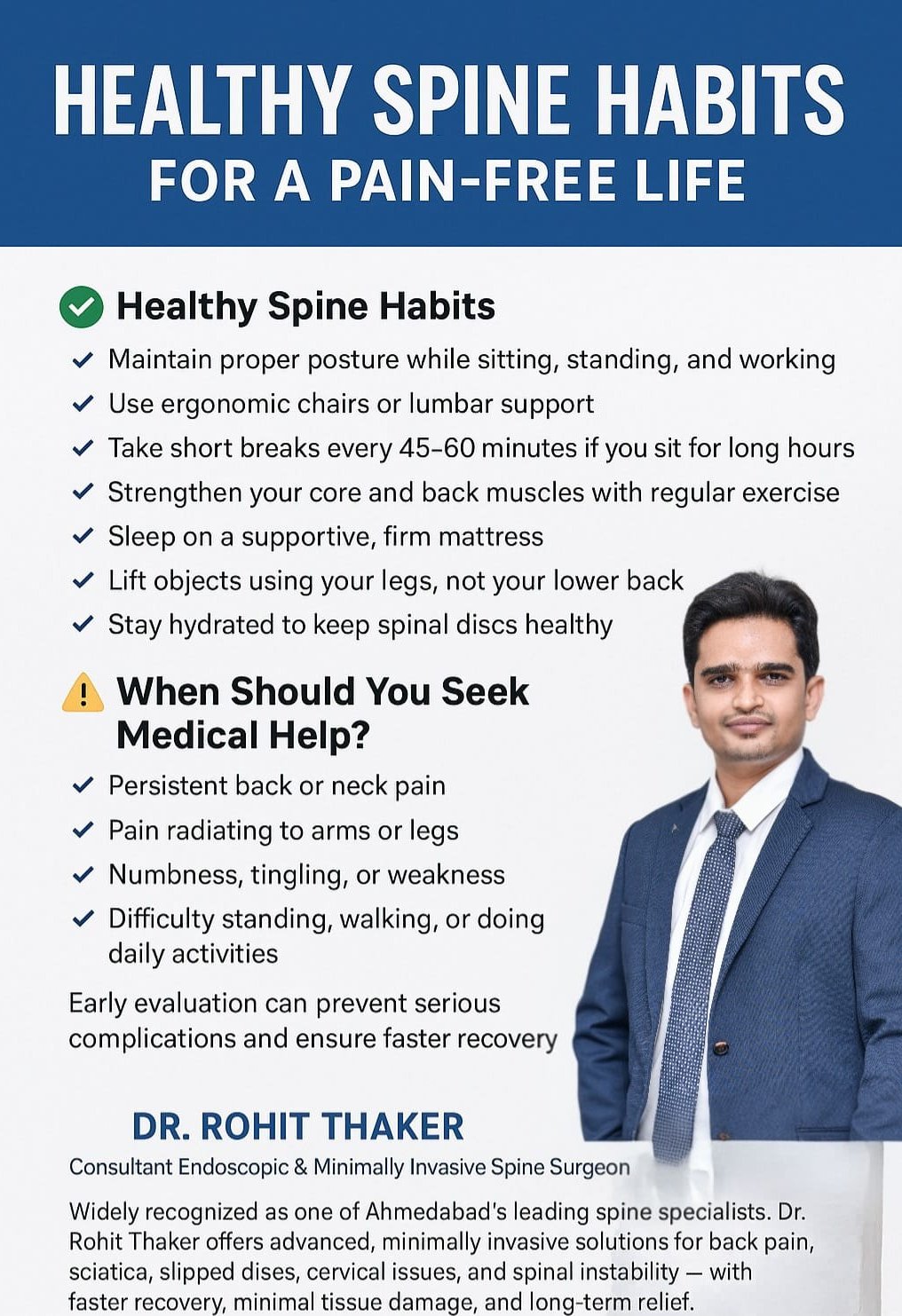 In this detailed guide, Dr. Rohit Thaker, one of Ahmedabad’s leading Endoscopic & Minimally Invasive Spine Surgeons, shares essential daily habits that help maintain a strong, healthy spine — and signs that indicate when you should seek medical care.